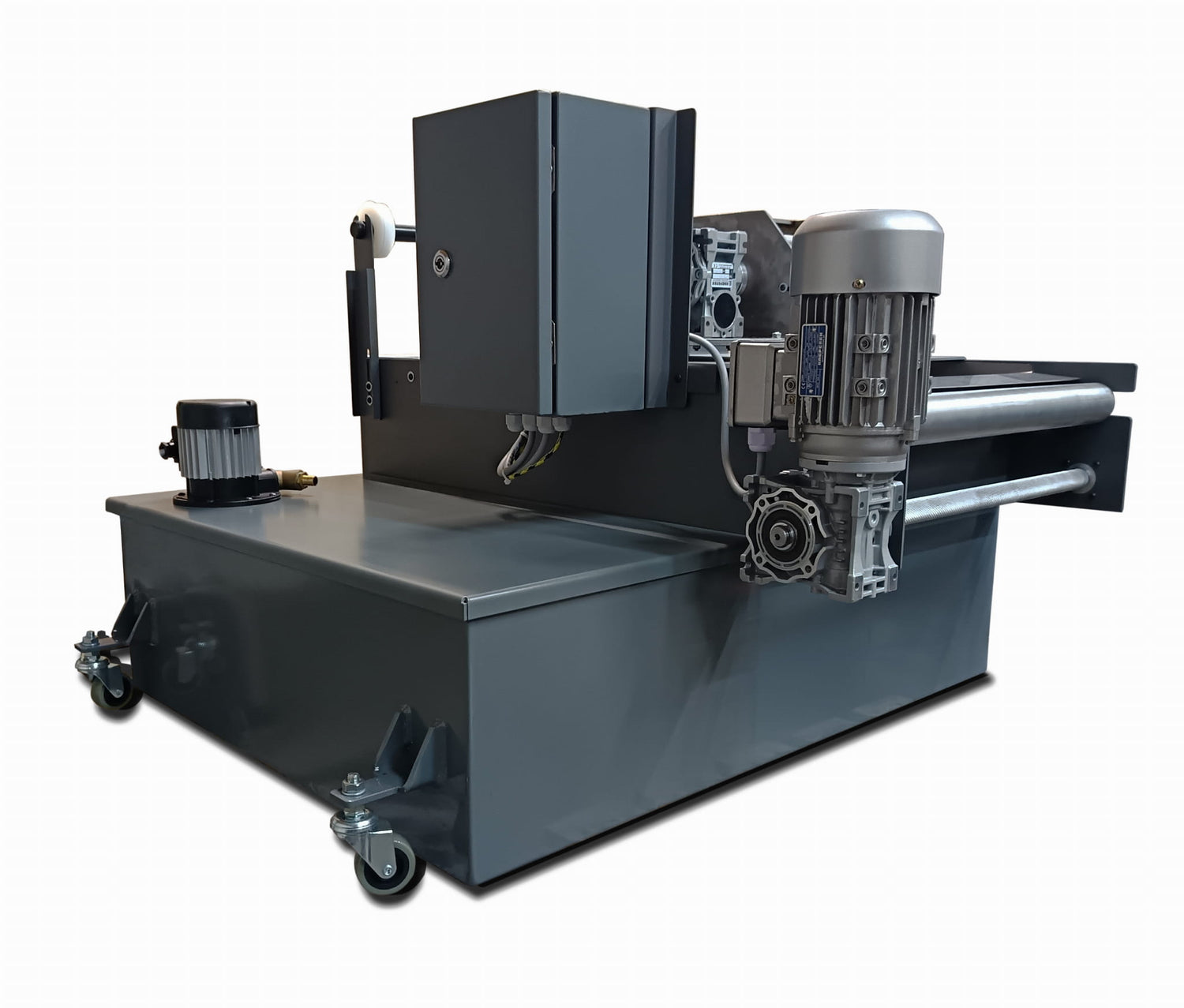 Das Kühlmittel fließt anschließend durch ein Filtergewebe mit geeignetem Gewicht, das feine, nicht magnetische Partikel zurückhält. Erreicht der Verschmutzungsgrad einen bestimmten Wert, aktiviert ein Schwimmersensor den Gewebevorschub, wickelt das verbrauchte Material auf die Walze und führt einen neuen Gewebeabschnitt zu. Dieser Vorgang läuft automatisch ab.